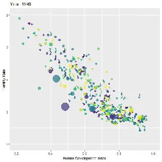 ИЧР указан по горизонтали, рождаемость — по вертикали. Размером кружков обозначена численность населения стран