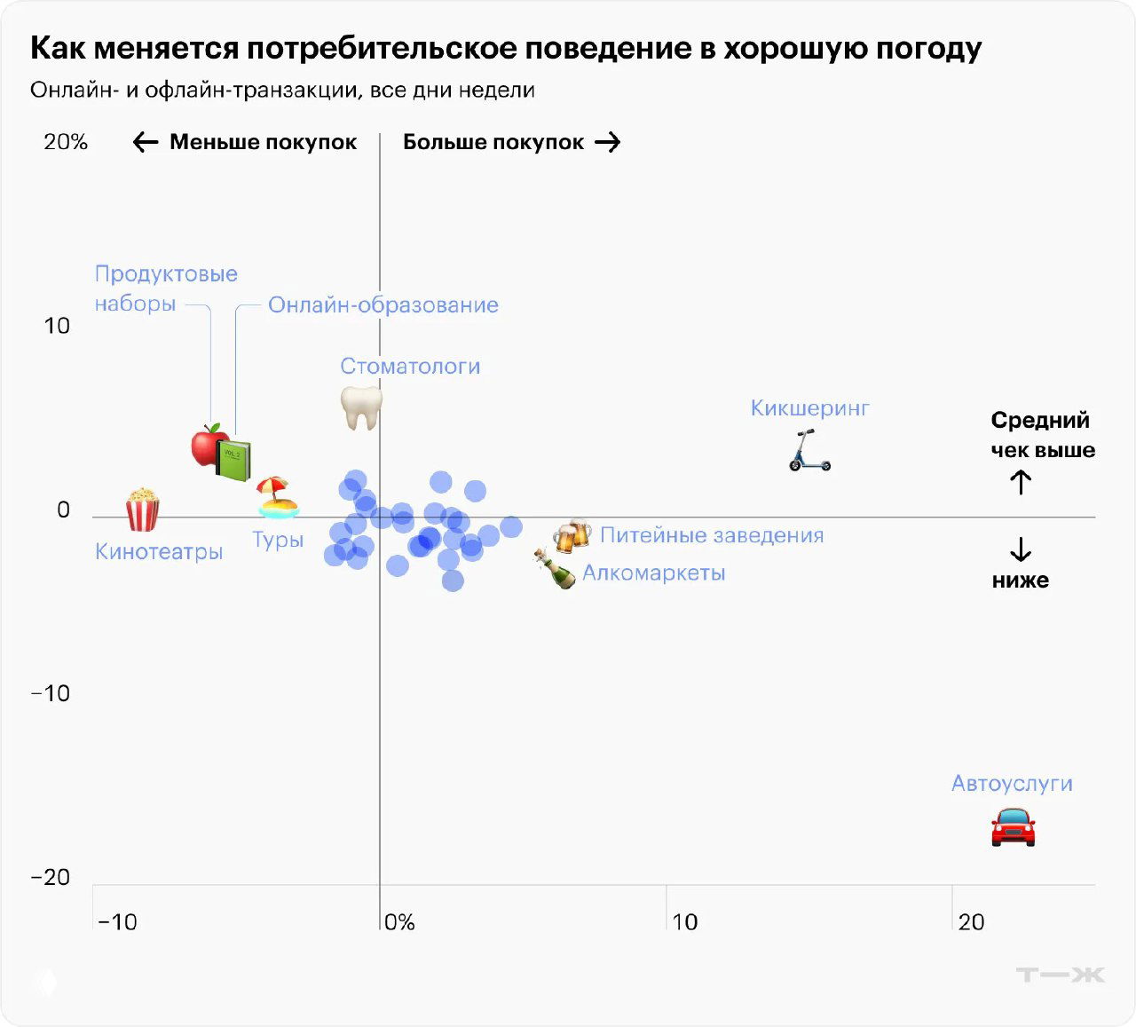 - больше всего погода влияет на автоуслуги: летом в хорошую погоду число транзакций растёт на 22%, а средний чек падает на 17