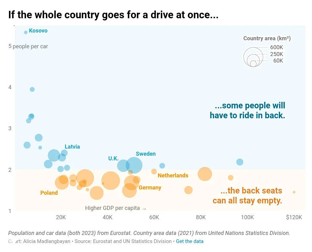 По вертикали указано число людей на одну машину, по горизонтали — подушевой ВВП, диаметром — площадь страны. Оранжевым отмечены страны, где на одну машину приходится не более двух людей