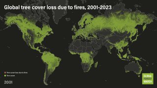 На диаграмме — ежегодные потери лесного покрова, связанные с пожарами (коричневый) и другими факторами (жёлтый). Причинами потери леса также могут быть расчистка для сельского хозяйства, сильные ветра или изменение русла рек