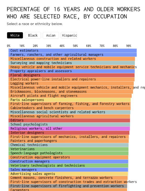 В данные входят профессии из классификации Бюро трудовой статистики США. В каждой из них работает не менее 50000 людей возрастом от 16 лет. Профессии сгруппированы по сферам и обозначены разными цветами, по горизонтали указан процент работников той или иной расы
