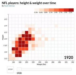 По вертикали указан рост в футах, по горизонтали — вес в фунтах, цветом обозначена доля игроков с этими показателями