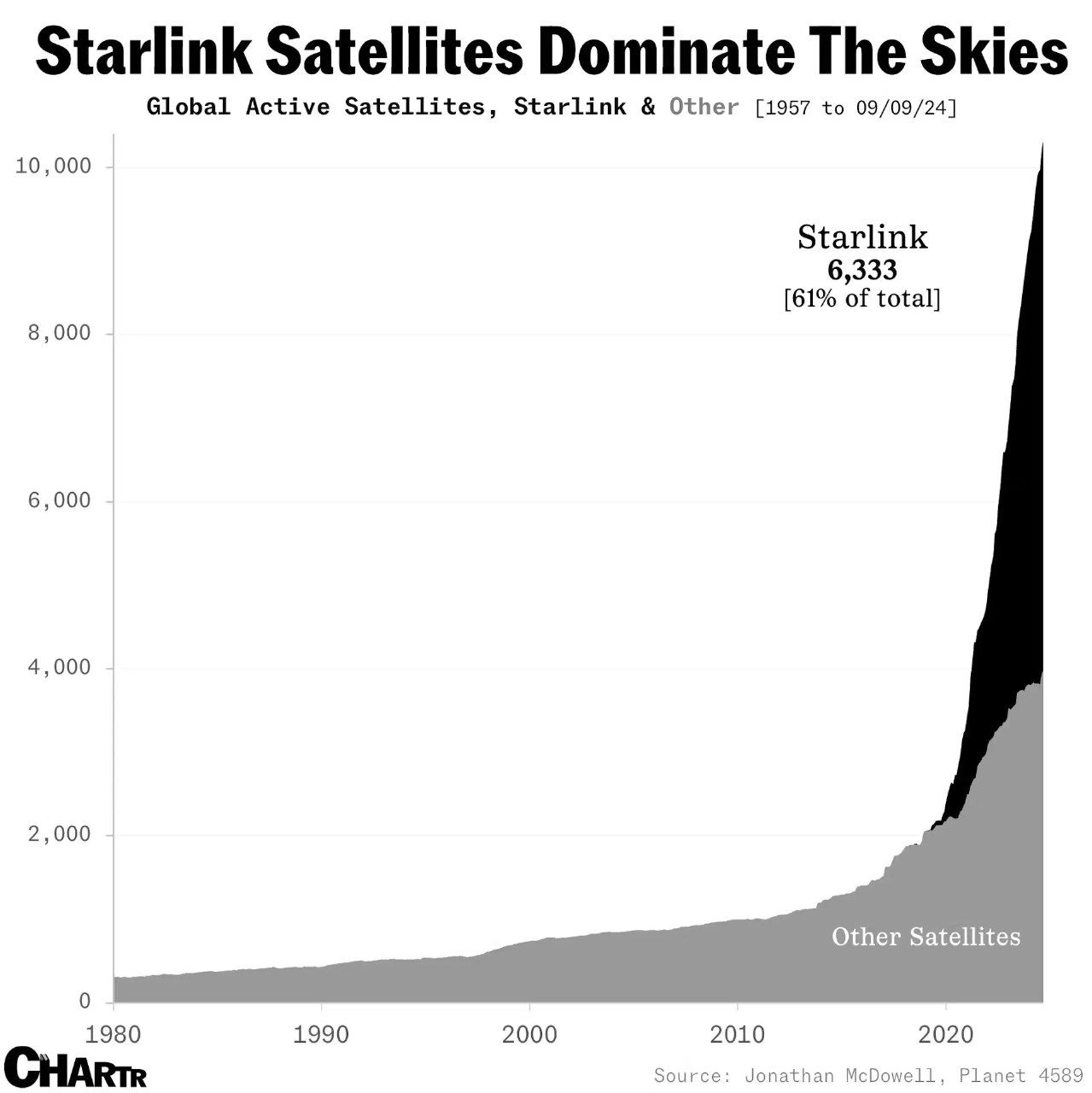 По состоянию на 9 сентября 2024 года, на околоземной орбите находилось 6333 спутника Starlink — 61% от общего числа