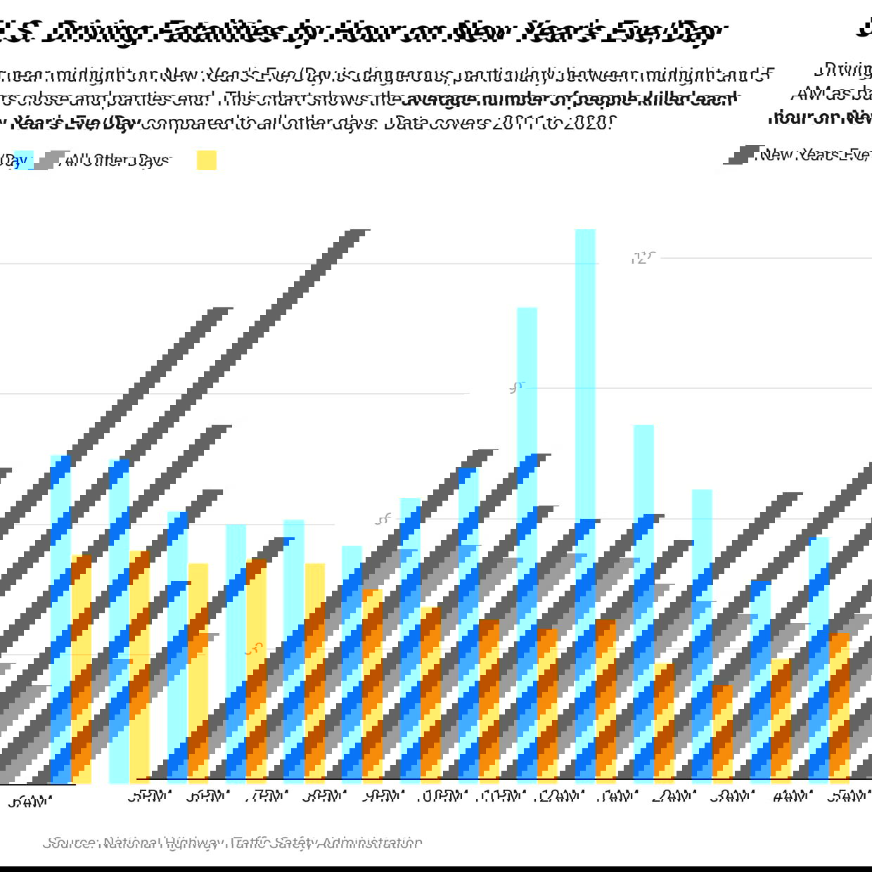 Голубые шкалы — среднее количество погибших в новогоднюю ночь за 9 лет, оранжевые — в остальные дни года