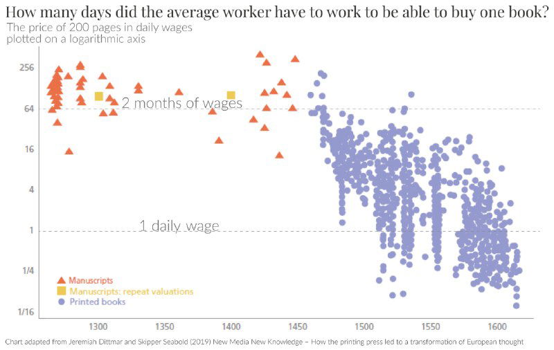 По вертикали указано число рабочих дней, шкала логарифмическая. Красным и синим указаны стоимости рукописных книг, синим — печатных. Напомним, что станок Гутенберга был изобретён в 1440-х годах