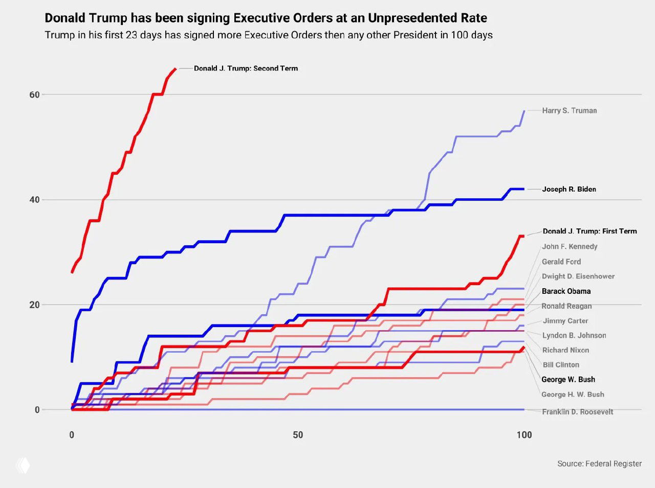 Данные (7 марта 1929–20 апреля 2025) — число указов в первый год срока у 16 последних президентов США; Трамп — за первые 101 день второго срока.