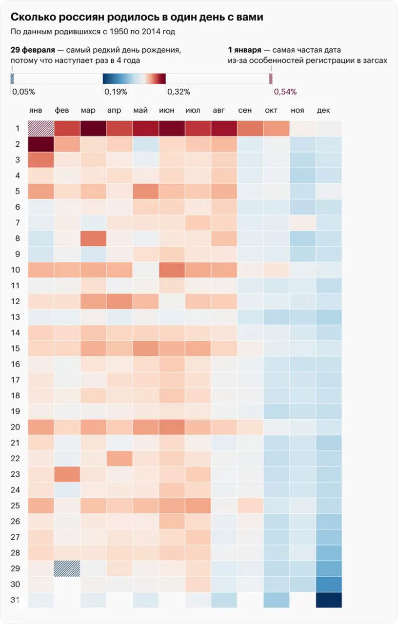 Они выяснили, в какие дни чаще всего рождались россияне, как менялись сезонность и тренды рождений и зачатий, как соотносится число браков с рождаемостью, а также сравнили свои данные с официальными регистрациями ЗАГС