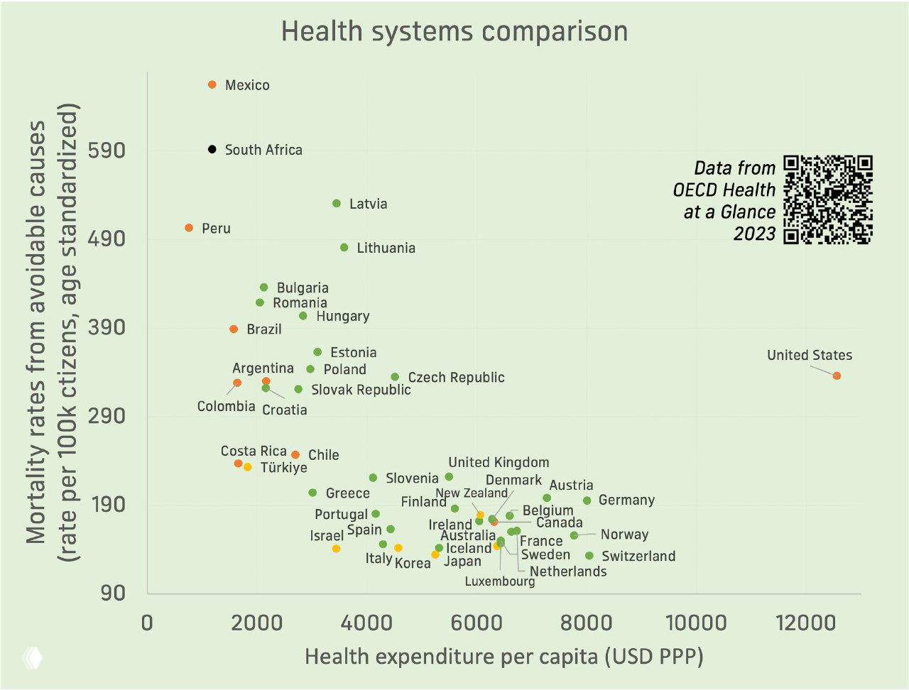 Сравнение подушевых расходов и смертности по странам ОЭСР (источник: OECD Health at a Glance 2023).
