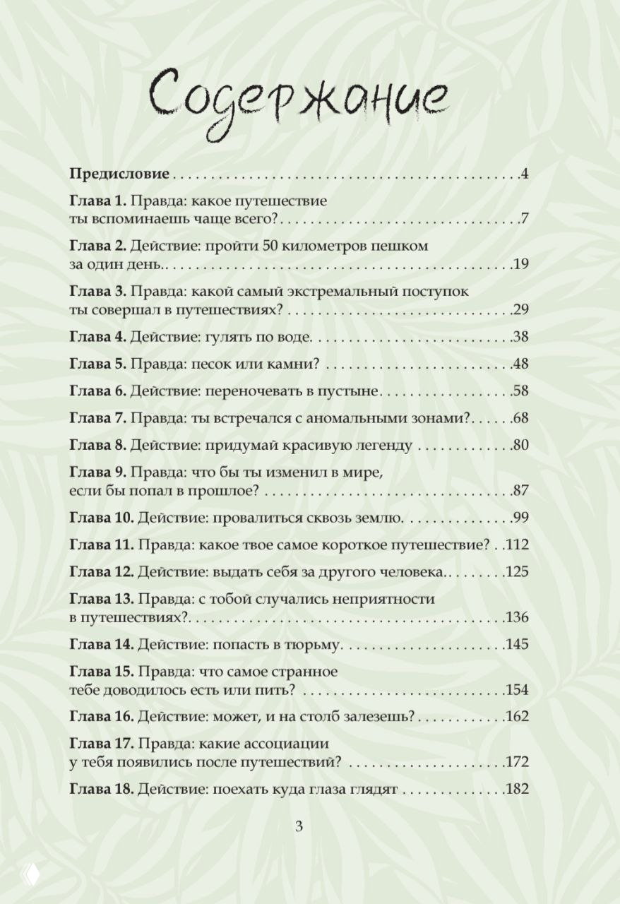 В "Читай-городе" можно изучить содержание и почитать отрывки из двух глав. Я построил книгу в формате игры "Правда или действие". С легким интерактивом, что в сочетании с динамичным и легким стилем по задумке создает ощущение диалога. Я делюсь впечатлениями, выбирая темы по очереди: сначала отвечаю на интересный вопрос, затем выполняю нетривиальное действие. Поэтому в главах бывают несколько регионов и стран: Италия легко уживается рядом с Казахстаном, а Карелия – с Волгоградской областью.