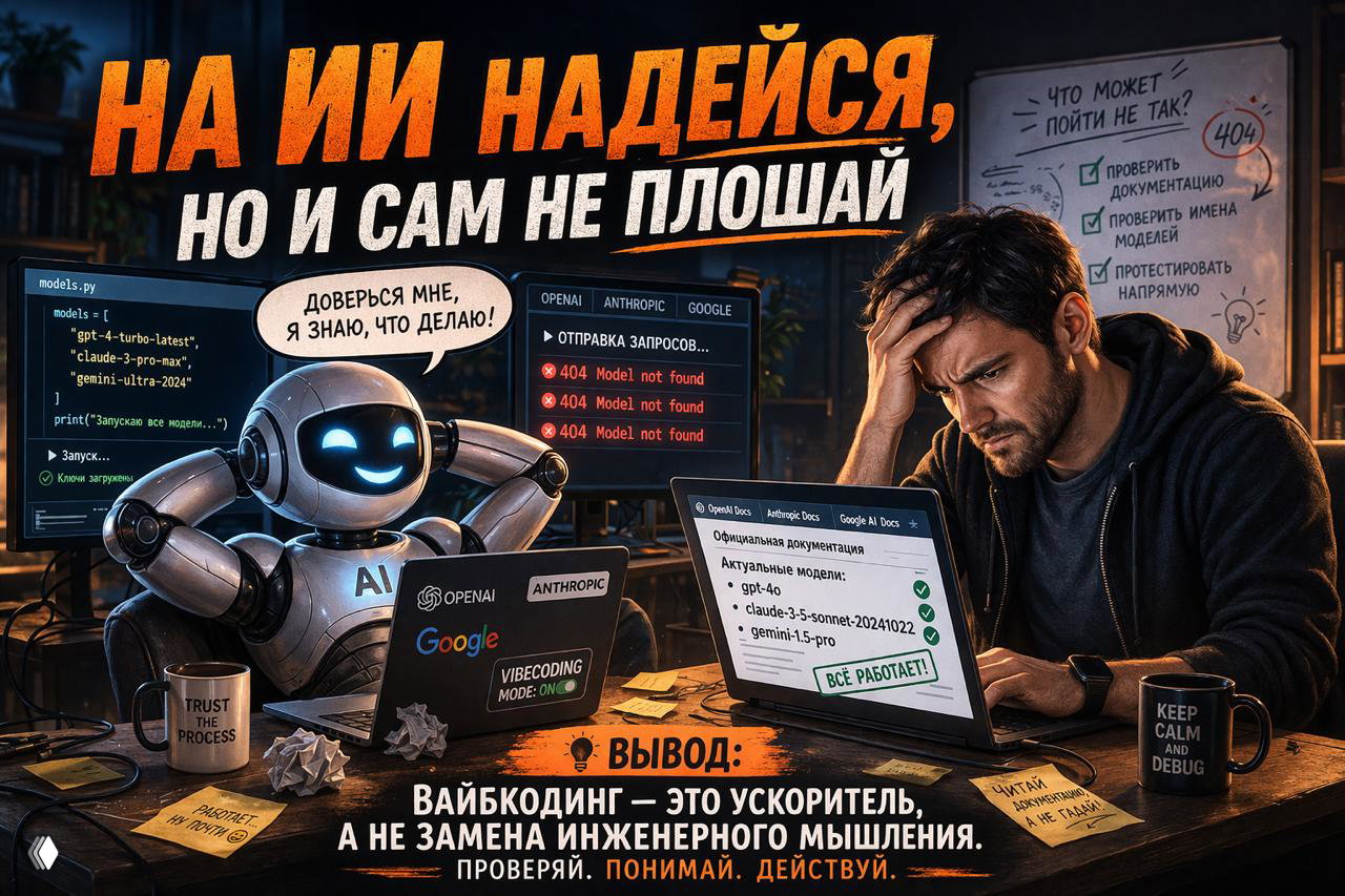 Оказывается, что ИИ аккуратно и уверенно подставил неправильные имена моделей. Причём у всех трёх провайдеров. Где-то это были устаревшие названия, где-то слегка искажённые, а где-то просто «похожие на правду» варианты, которые он сам и сгенерировал.