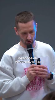 Мужчина на сцене с микрофоном в белом свитшоте, крупный план выступления; на изображении текст «КАТЕГОРИЯ РАССЛАБЛЕНИЯ».