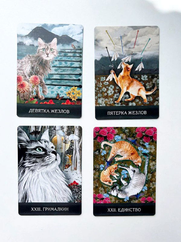 - ✅Грималкин. Это существо из британской мифологии, и в одном из произведений 15 века таким было имя одного из говорящих котов. На карте мы видим большую кошку посреди волшебного леса. Она выглядит очень мудро, и мы буквально чувствуем спокойствие и умиротворение, исходящее от этой карты. Она говорит нам о том, что надо прислушаться к своей интуиции и внутреннему голосу. Он обязательно приведет вас к нужному результату.