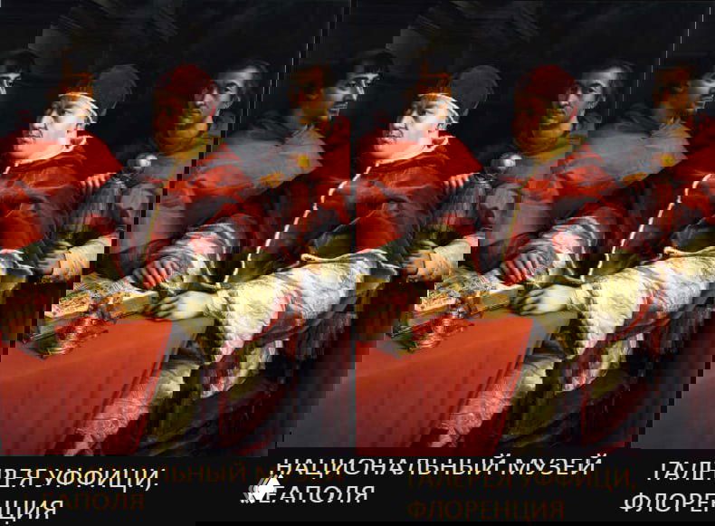 В 1518 году по заказу папы Льва Х Рафаэль пишет его портрет в окружении кардиналов. Льва сменил на посту Джулио Медичи (он на портрете слева) и забрал портрет себе. В один прекрасный день его дворец посетил герцог Мантуи Гонзаго и, воспылав страстью к искусству, предложил папе продать картину ему. Медичи в восторге не был, но отказать не смог. Единственным условием была отсрочка на 10 дней для выполнения копии. Быстро наняли ученика Рафаэля Андреа дель Сартро и, вуаля – готово! Оригинал отправили герцогу, точную копию и мешок денег обрел Медичи, все счастливы.