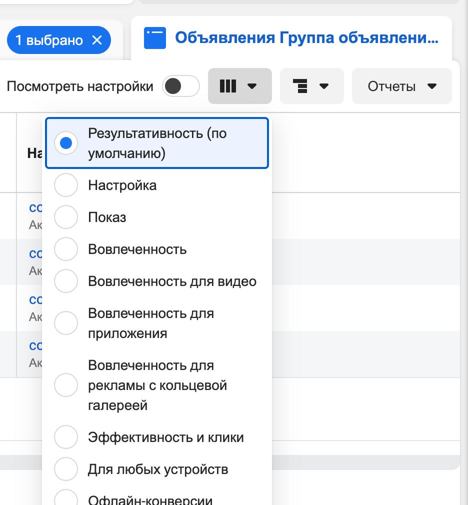 - Выбираете Вовлеченность для рекламы с кольцевой галерей. Вы увидите специальные метрики для рекламы с кольцевой галерей.