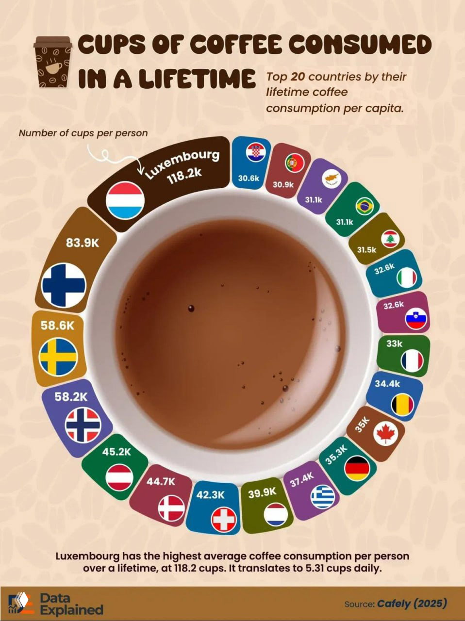Первое место в этом рейтинге с солидным отрывом занимает Люксембург — в этой стране среднестатистический житель выпивает 118,2 тыс. чашек кофе в течение жизни (примерно 5,3 чашки в день). На втором месте идет Финляндия (83,9 тыс. чашек), а замыкает тройку Швеция (58,6 тыс.). В топ-7 также вошли Норвегия (58,2 тыс.), Австрия (45,2 тыс.), Дания (44,7 тыс.) и Швейцария (42,3 тыс.).