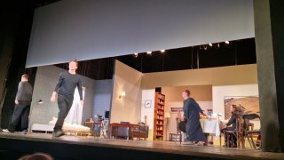 Спектакль начинается с поминок по первой жене Серебрякова, которые перетекают в его свадьбу с Еленой настолько неожиданно, что невольно думаешь: "а так можно было!?" И такие шоковые переходы и сцены будут на протяжении всего спектакля. Жизнь здесь, как смонтированная пленка. Любовь возникает на фоне семейного скандала, тихий разговор взрывается истерикой, а сцена измены снимается на камеру и тут же превращается в учебный материал для лекции о монтаже. Эти обрывы создают ощущение всеобщей потерянности: герои, как мальчик с картины Эндрю Уайета "Зима", что висит на стене, бегут, но не знают куда.
