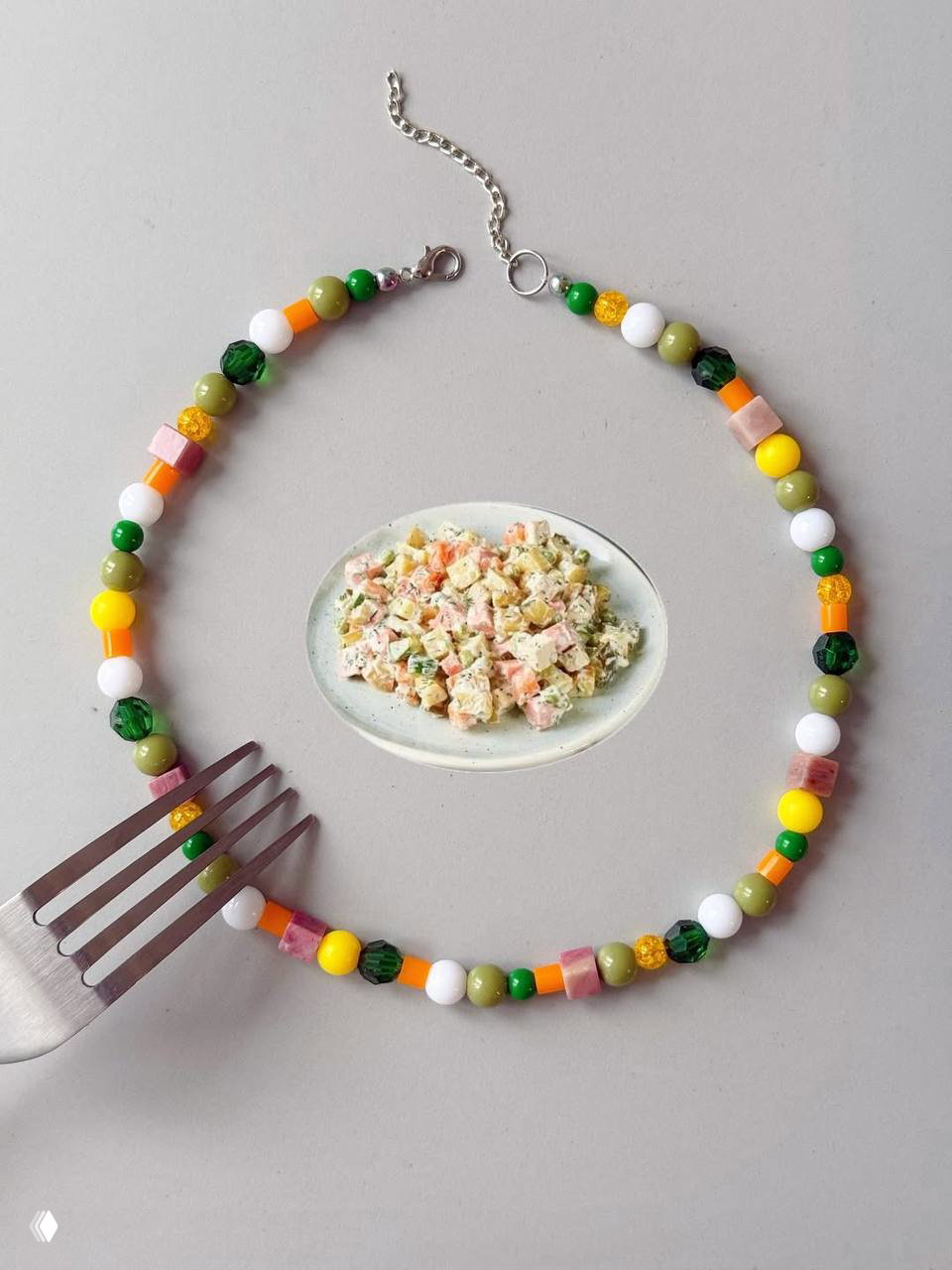 Колье-оливье создала мастерица из бренда Psheno. Колбаса — это натуральный родонит (поддерживает любовь, успокаивает и стабилизирует), а основное наполнение — акрил и немного стекла. Ожерелье стоит 1650 рублс и, самое прикольное, приезжает в контейнере из-под салата.