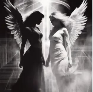 Два ангела, женщина, бегущая на работу, крутая лестница.