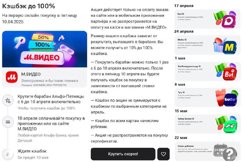 🛍 В приложении Альфа-Банка появился ещё барабан (в поиске пятница) - с кэшбэком до 100% за первую покупку в пятницу 10.04.26 в приложении или на сайте М.Видео картами банка, кроме Детских. Ни с чем не суммируется, сверх лимита по ПЛ, выплата 10.05.26, сертификаты - мимо. FAQ / Правила.