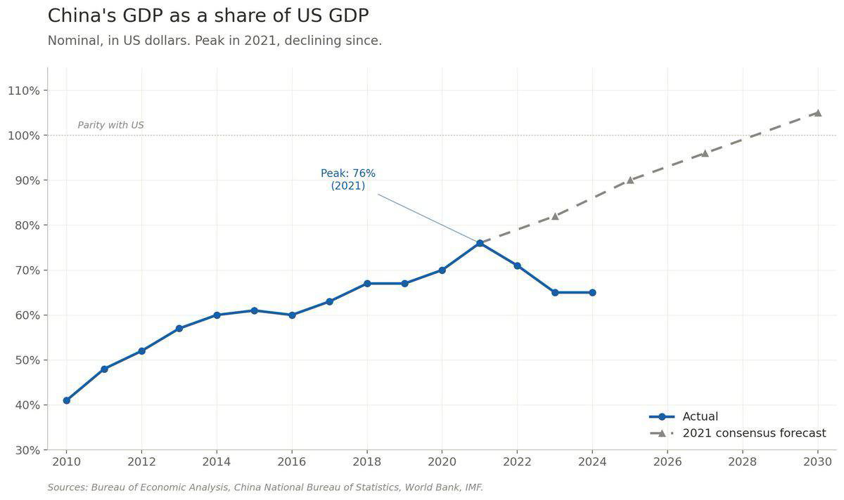 В 2021 году ВВП Китая достиг 76 процентов ВВП США, и существовал консенсус, что он превзойдет США до 2030 года.