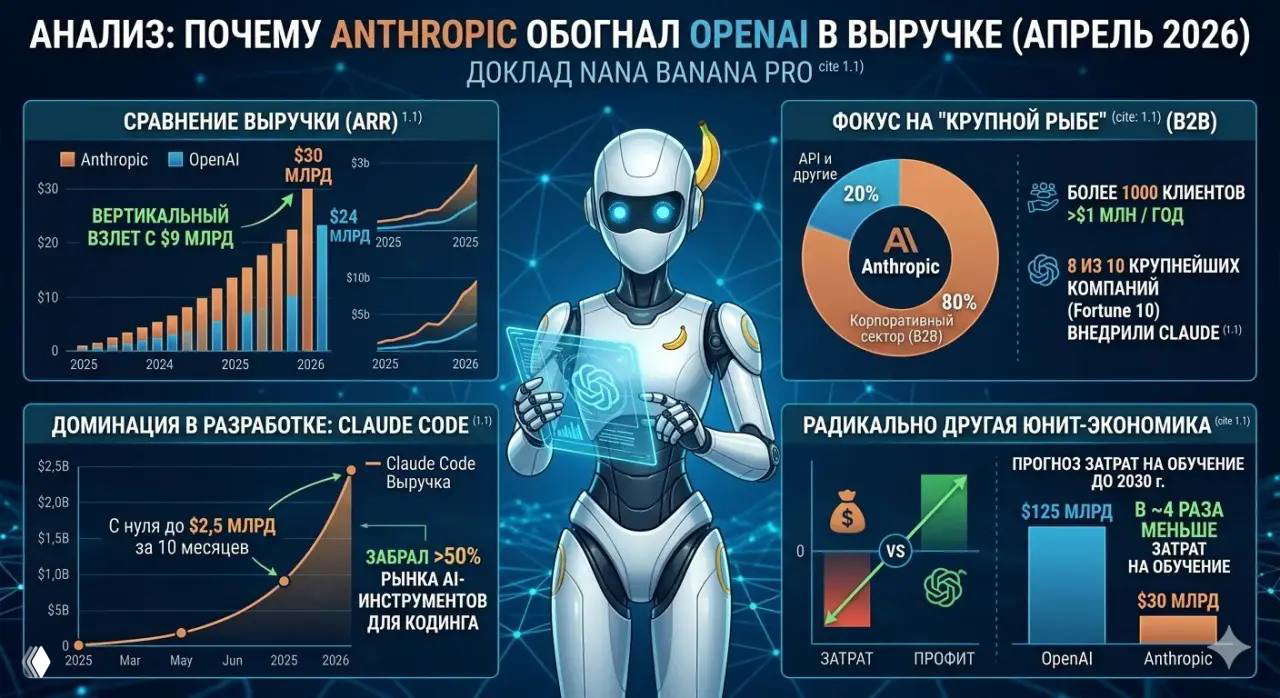 Anthropic зарабатывает больше, а тратит на обучение своих моделей примерно в 4 раза меньше конкурента. К 2030 году OpenAI планирует сжечь на обучение около $125 млрд, тогда как Anthropic прогнозирует затраты на уровне $30 млрд.