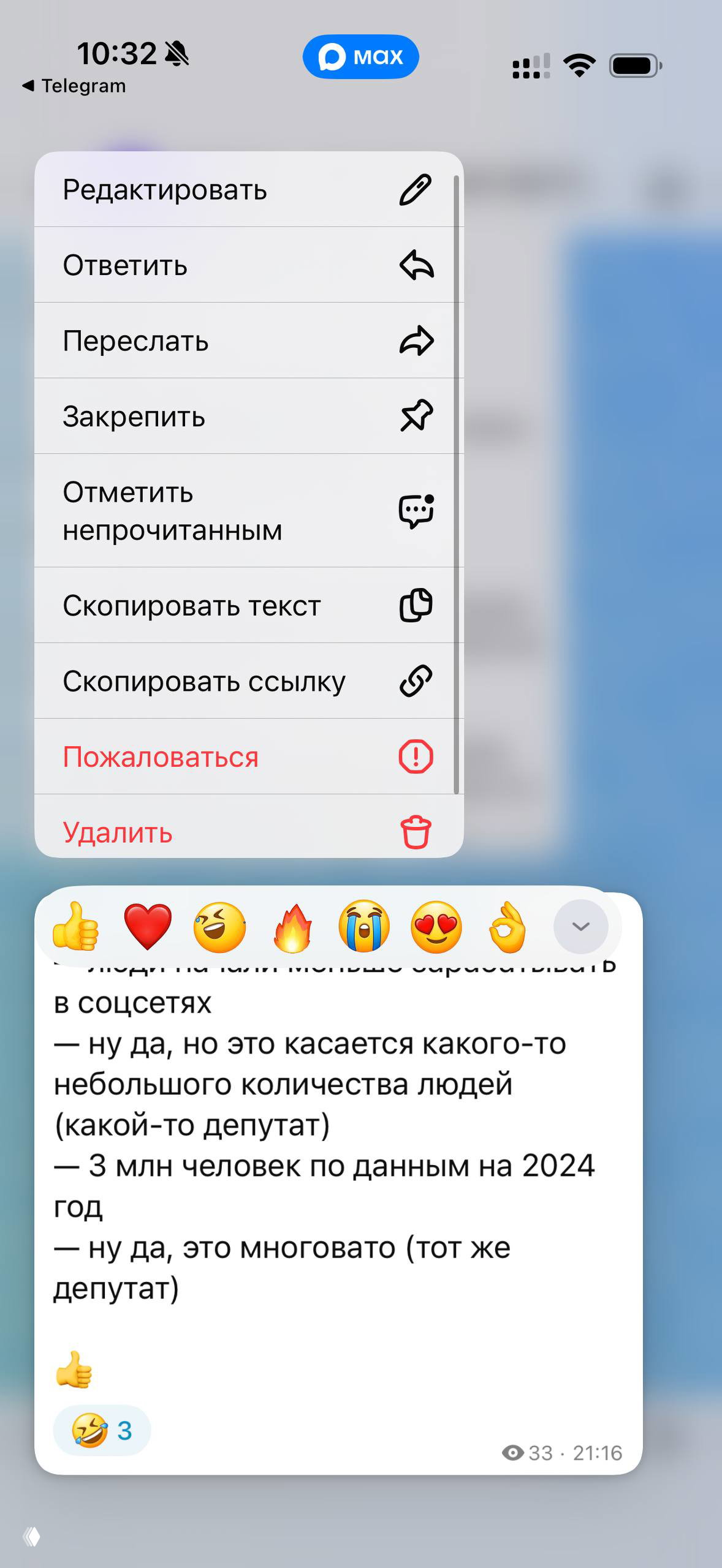 Мне нравится, что в Максе я могу пожаловаться даже на свой пост в своём канале