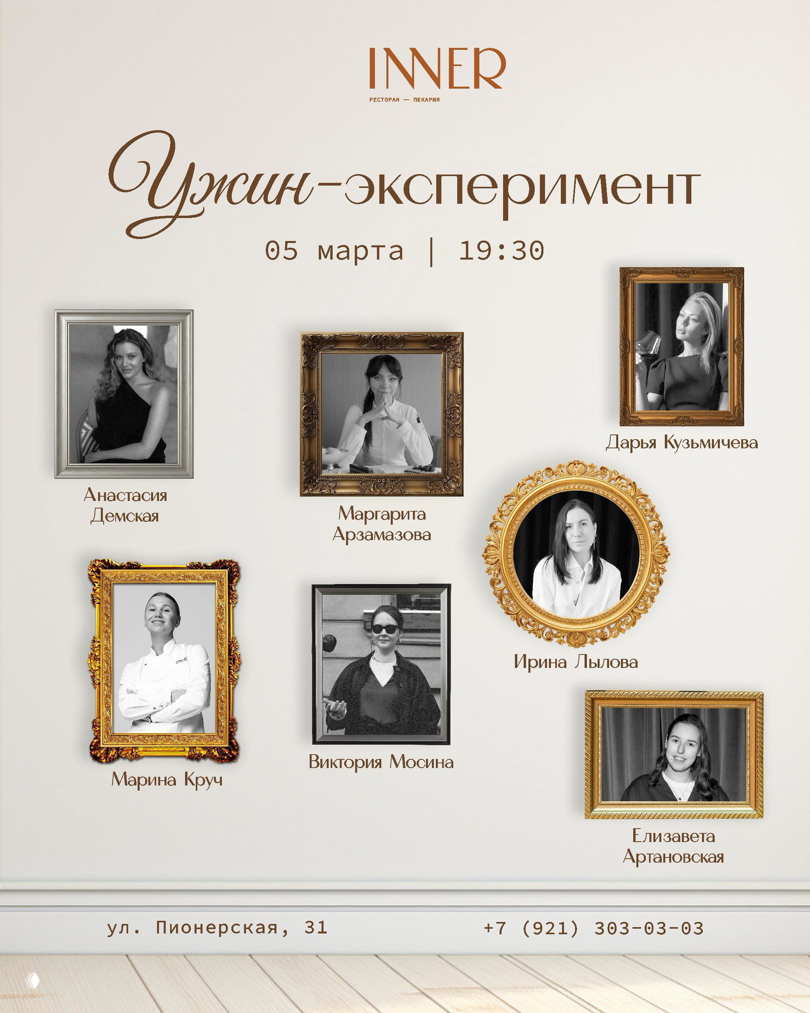 5 марта в INNER собираются девушки из гастроиндустрии, и не просто на ужин, а на эксперимент. Девушки выйдут из привычного амплуа, поменяются ролям и соберут меню из пяти курсов. Шеф-кондитер станет бар-леди, а сомелье — автором горячего блюда.