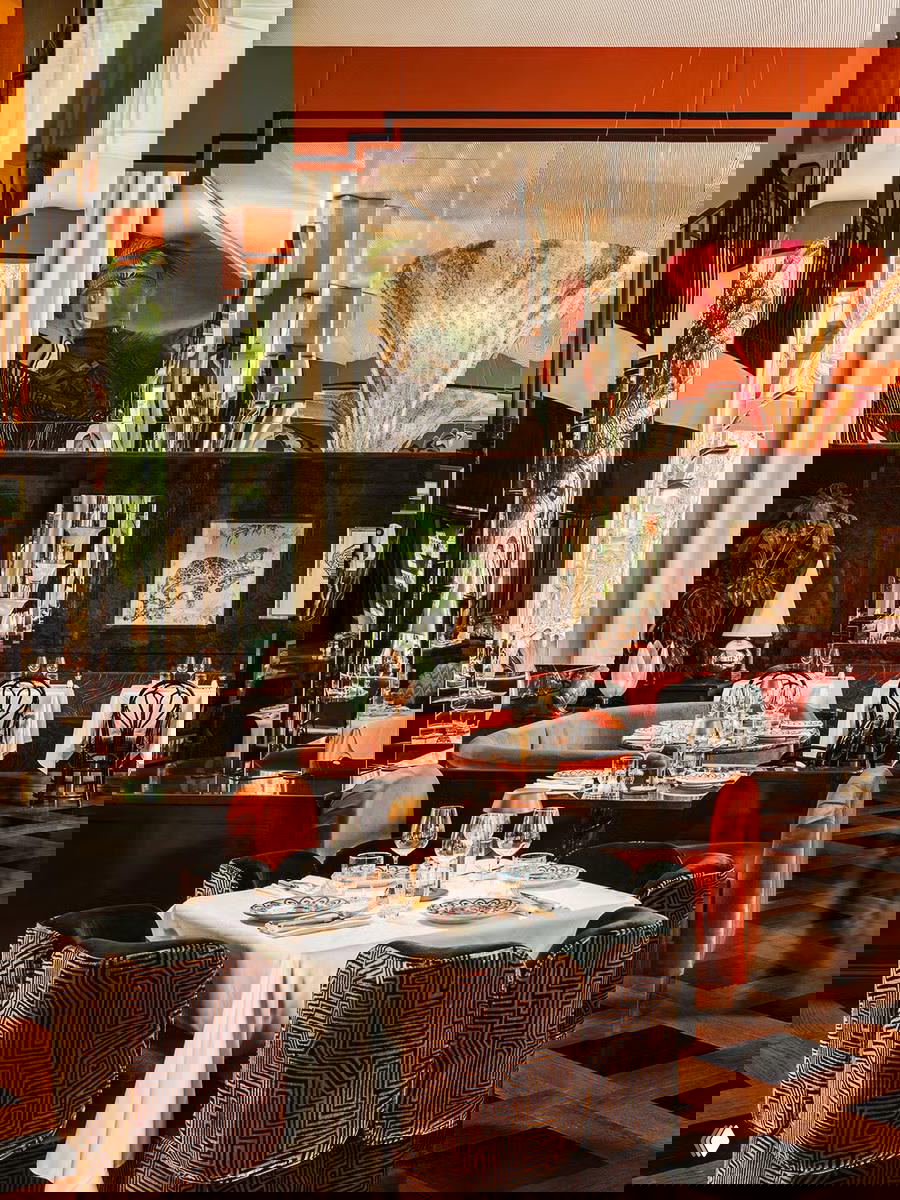 Двухэтажный ресторан площадью 850 квадратных метров выполнен в эклектичном, максималистском стиле — с высокими зеркальными колоннами, 400-килограммовыми потолочными муранскими светильниками, изготовленными на заказ коврами и винтажными предметами.