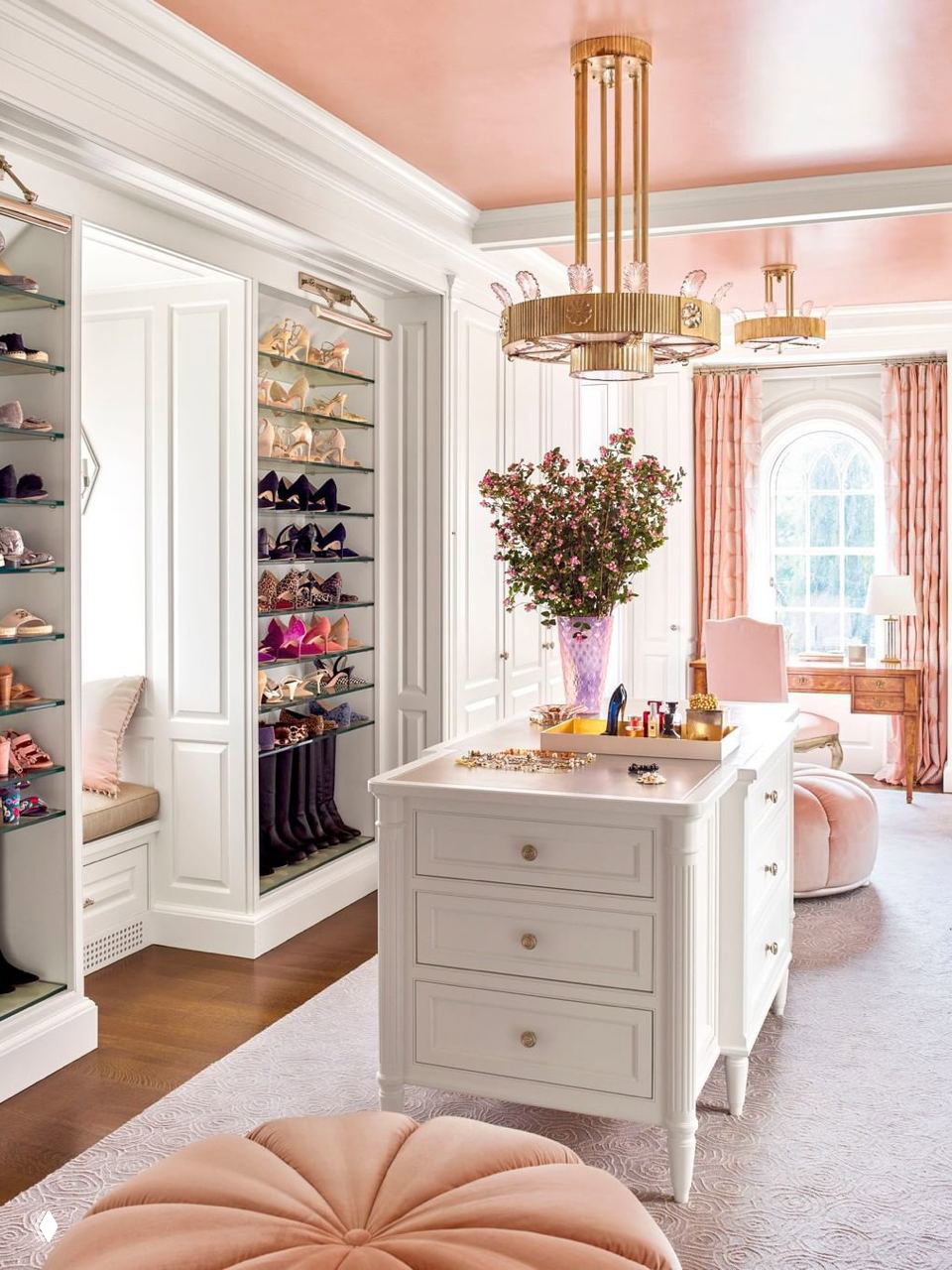 - ✓ Пространство в гардеробной стоит использовать на все сто процентов, поэтому лучше, чтобы система хранения была до потолка. На уровне вашего роста разместите одежду и аксессуары, которыми пользуетесь постоянно, наверху — сезонную и редко используемую одежду, чемоданы и коробки с обувью.