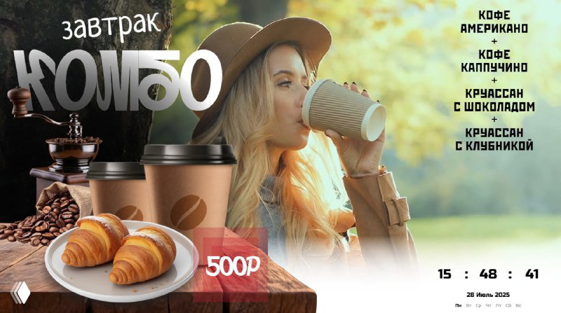 Шаблон доступен в обеих версиях конструктора, однако в PRTV.pro дополнительно реализована поддержка фоновой музыки, созданной специально под атмосферу и стиль кофейни. Шаблон состоит из трех слайдов: ассортимент кофе, комбо-завтраки, десерты.