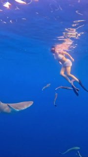 «Извините, но это видео летит в ленту! Сбылась моя мечта, побороть свой страх и поплавать с акулами в открытом океане. Я собой горжусь, несмотря на страх и адреналин, собралась и сиганула в воду прямо в одежде. Эмоции на всю жизнь»,
